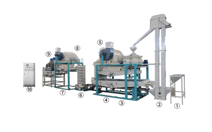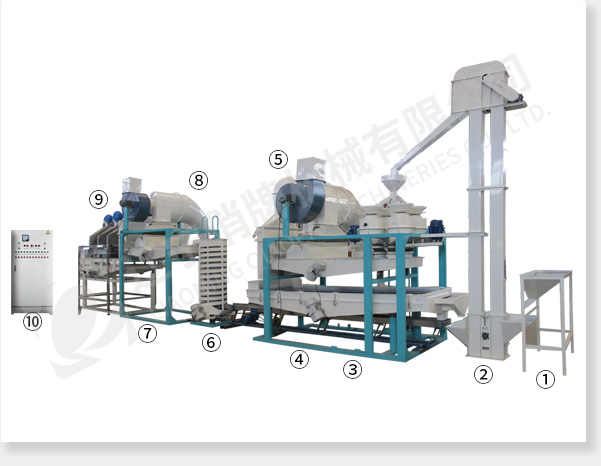 上料斗斗式提升機(jī) 脫殼、風(fēng)選、分選主機(jī) 板簧輸送機(jī) 立式風(fēng)選系統(tǒng) 螺旋提升機(jī) 振動(dòng)輸送風(fēng)選機(jī) 立式風(fēng)選系統(tǒng) 靜電風(fēng)選機(jī) 電氣控制柜