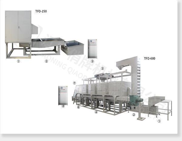TFD-600型: 上料斗 ② Z型提升機  喂料小車  脫皮機(4臺)  送料篩(2臺)  除糠篩和分選篩  排塵系統(tǒng)  電氣控制柜