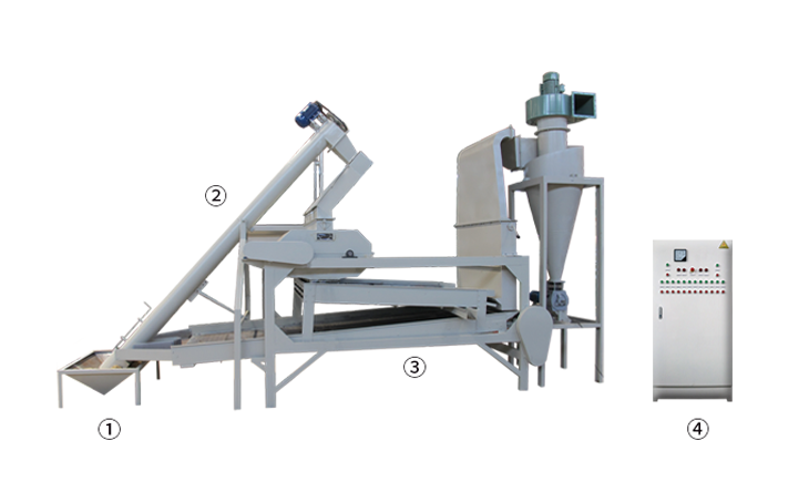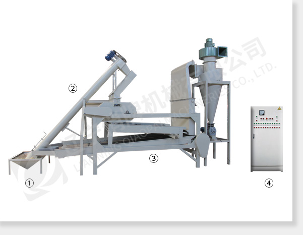 ① 上料斗 ② 絞龍螺旋輸送機 ③ 脫殼、風選、分選主機 ④ 電氣控制柜